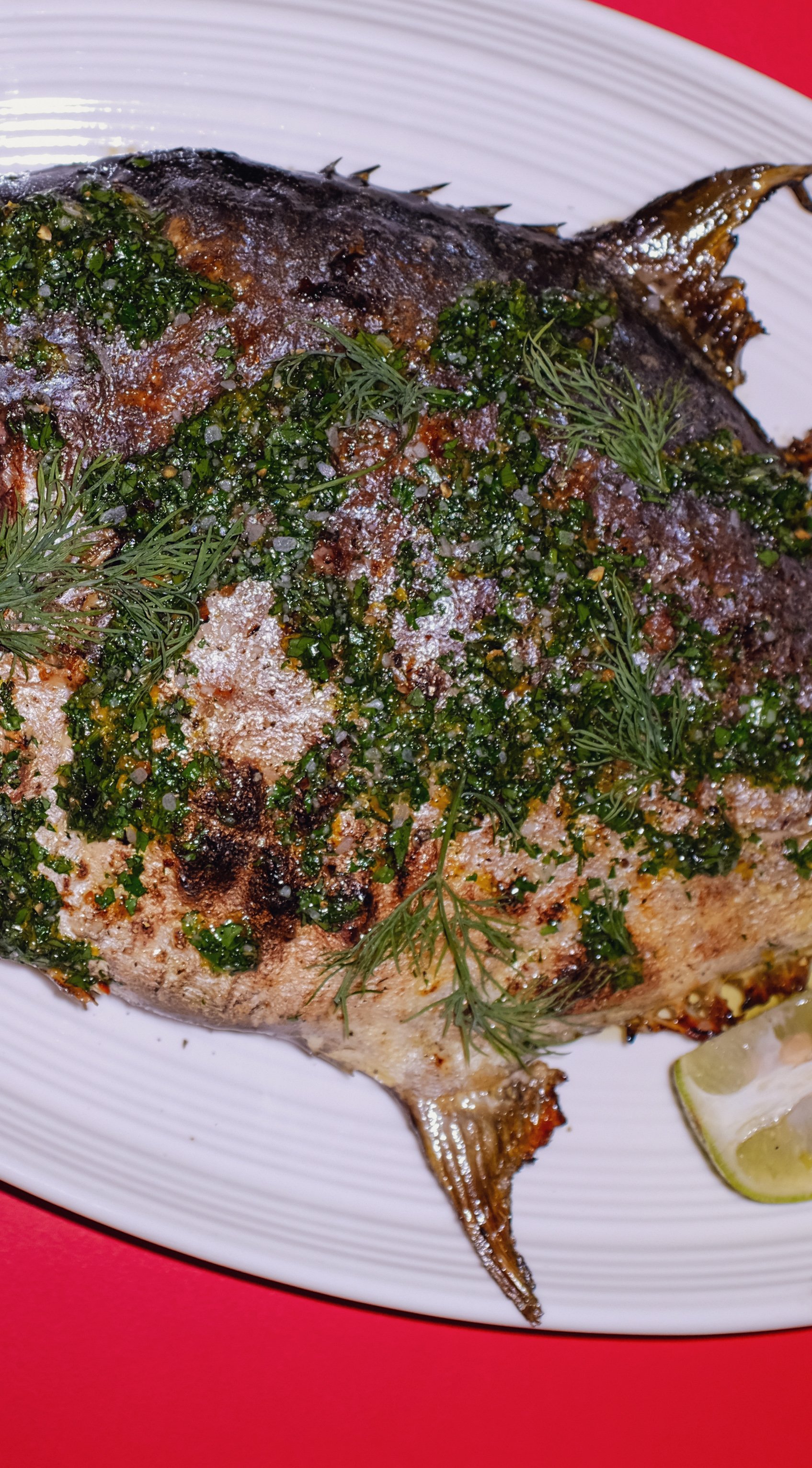 Char-grilled fish of the day, gremolata, lime wedge