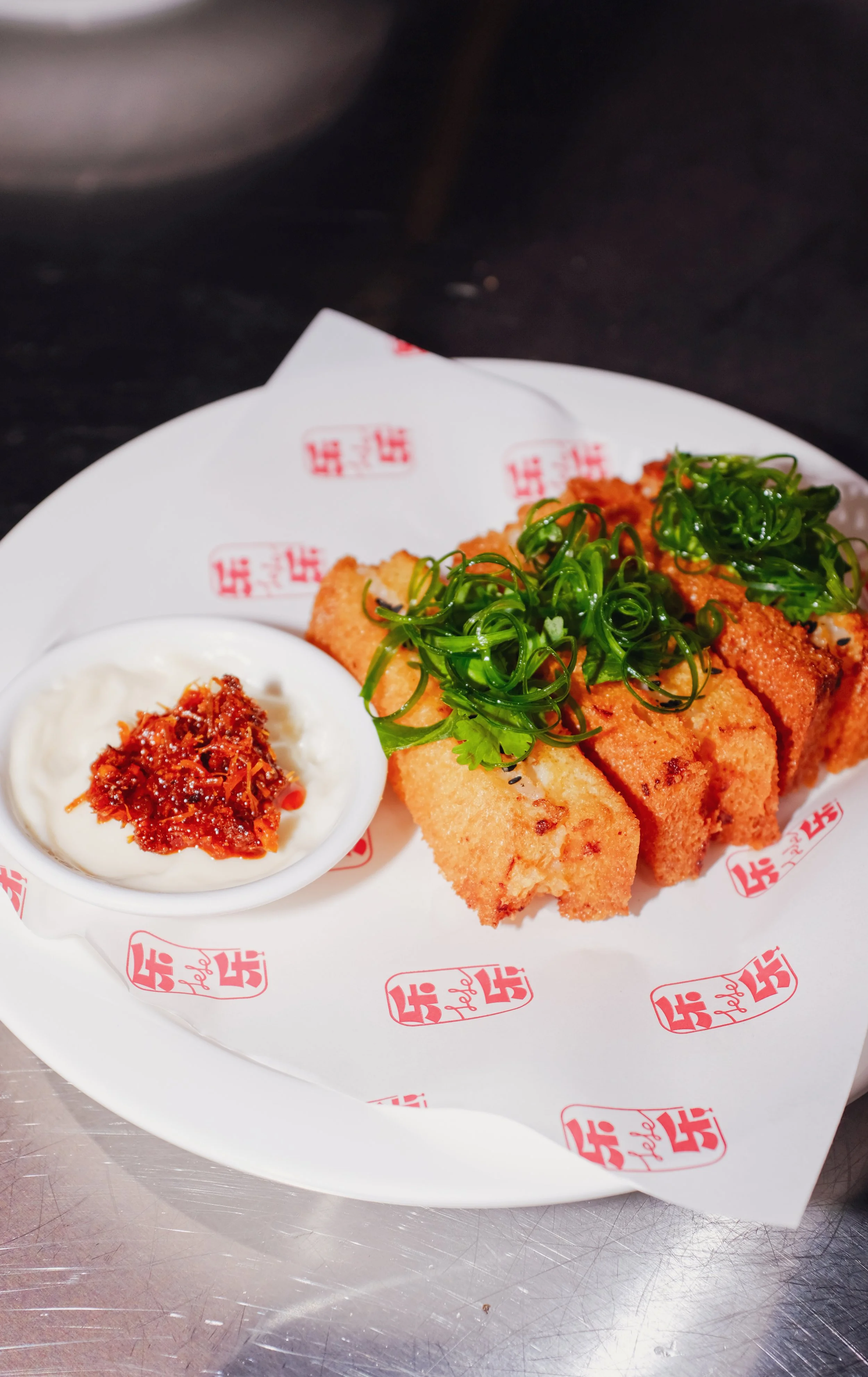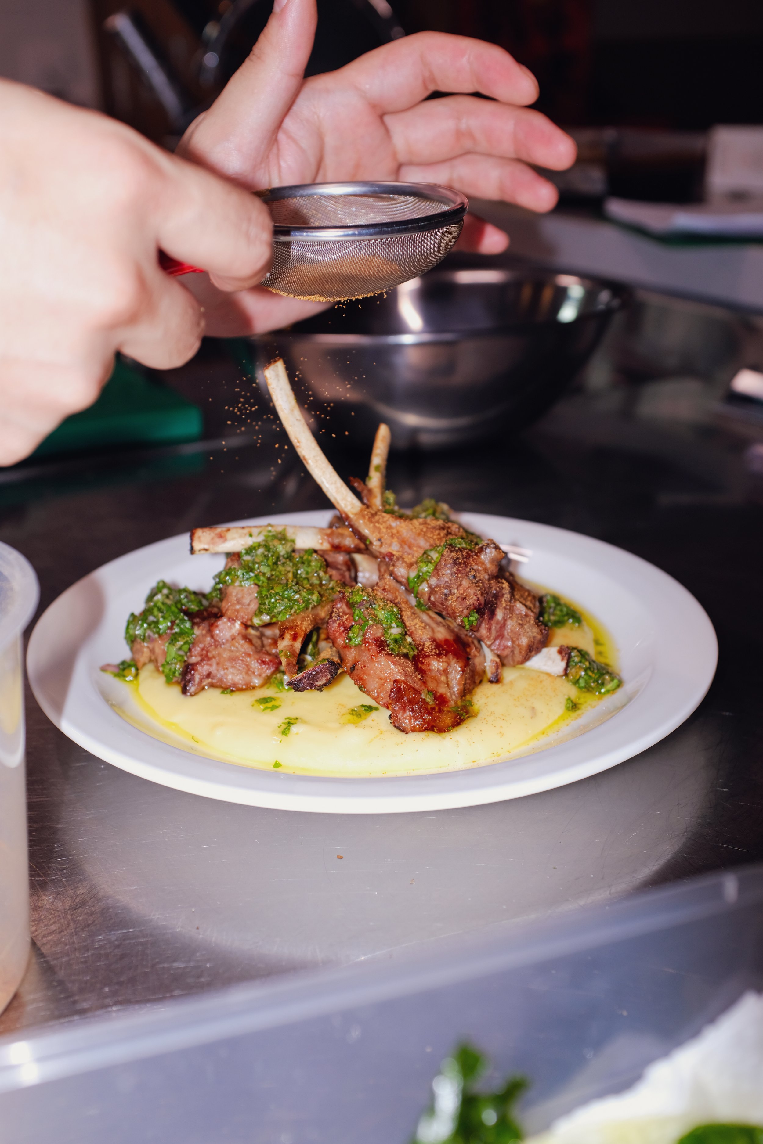 Char-grilled lamb racks, cilantro salsa, crispy kailan, mashed potatoes