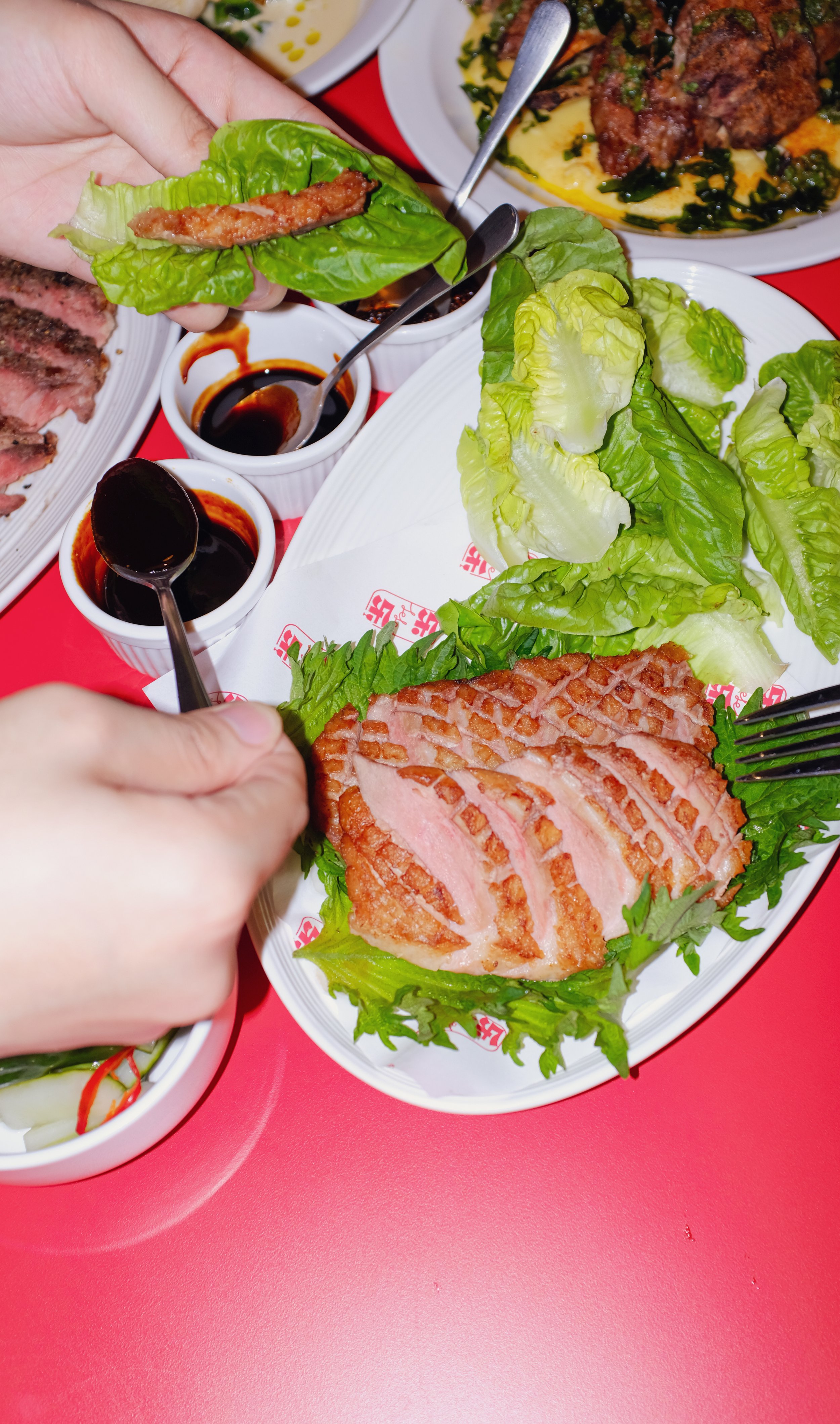 Duck breast, cucumber salad, lettuce, soy pineapple sauce, chili oil
